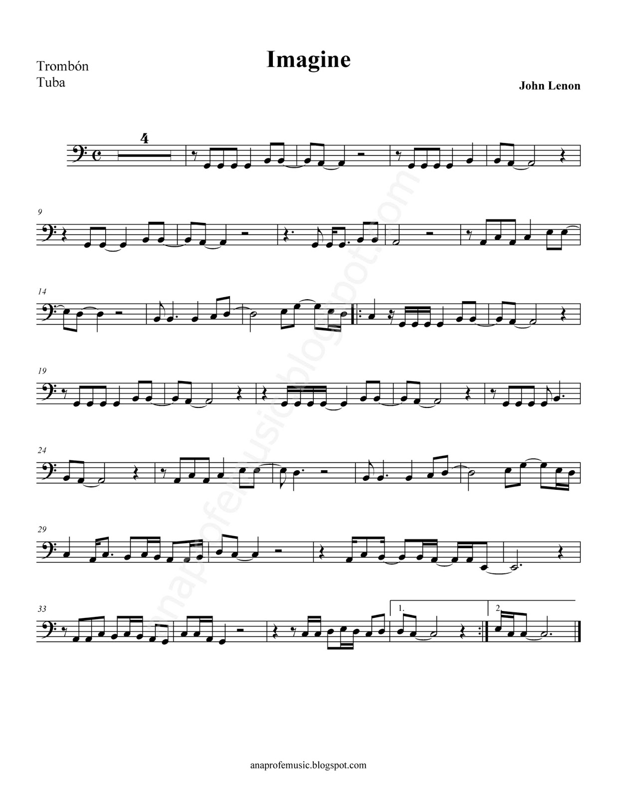 PARTITURA IMAGINE, John Lenon - Partitura para trombón y tuba - trombone sheet music